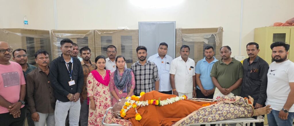 आत्तापर्यंत 200 देहदान 156 अवयवदान जगद्गुरु नरेंद्राचार्य महाराज संस्थान नाणिजधाम रत्नागिरी यांच्या वतीने विविध राज्यात व जिल्ह्यात होत आहे ज.न.म संस्थानाकडून जगद्गुरु रामानंदाचार्य नरेंद्राचार्यजी यांच्या प्रेरणेतून ही चळवळ मोठ्या प्रमाणात राबवली जात आहे. याचाच एक भाग कै. विवेकानंद बाळकृष्ण रावळ मु.पो. कोल्हापूर नाका स्वामी मळा इचलकरंजी तालुका हातकणंगले जिल्हा कोल्हापूर वय वर्षे ६४ यांचे वृद्धाप काळाने बुधवार दिनांक १५/४/२०२६ रोजी मृत्यू झाला त्यांनी मृत्यू पश्चात देहदान करण्याचा संकल्प जगद्गुरु नरेंद्राचार्य महाराज संस्थान नाणिजधाम रत्नागिरी यांच्याकडे देहदान करण्यासंदर्भात फॉर्म भरून दिला होता त्या अनुषंगाने त्यांची मरणोत्तर देहदान करण्याची इच्छा होती त्यांची मुले श्री सुनील रावळ व अनिल रावळ यांनी ज.न.म. संस्थान नाणिजधाम यांच्याशी संपर्क साधून आपल्या वडिलांची मरणोत्तर देहदानाच्या इच्छापूर्तीसाठी कळवले संस्थानाने तात्काळ दखल घेऊन कोल्हापूर जिल्हा रामानंद संप्रदाय संघटनेच्या पदाधिकाऱ्यांशी संपर्क करून सदरचे 198 मरणोत्तर देहदान हे राजर्षि छत्रपती शाहू महाराज शासकीय वैद्यकीय महाविद्यालय कोल्हापूर यांच्याकडे केले यावेळी डॉक्टर. सौ.संध्याराणी पाटील प्राध्यापक व विभाग प्रमुख शरीररचना शास्त्र व त्यांचा स्टाफ तसेच मरणोत्तर देहदान दात्यांच्या वतीने नातेवाईक बाळकृष्ण आप्पाजी रावळ — वडील श्रीमती विमल विवेकानंद रावळ– पत्नी सुनील रावळ मोठा मुलगा अनिल रावळ — लहान मुलगा ,स्नेहल सुनील रावळ — मोठी सुनशोभा रावळ–मुलगी हणमंत रावळ — जावई नातवंडे ज्ञानेश्वरी रावळ रुद्र रावळ पूजा रावळ श्रीकांत रावळ श्रीहरी रावळ सहर्ष रावळ अरुण रावळ– भाऊ कल्पना रावळ — भावज
