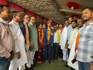 कार्यक्रम के तहत बारात लक्ष्मी स्मृति मंगल भवन, नगर पालिका पांढुर्णा से बाजे-गाजे के साथ प्रस्थान कर विवाह स्थल कृषि उपज मंडी समिति शेड प्रांगण पहुंची, जहां प्रशासन द्वारा माननीय अतिथियों एवं बारातियों का भव्य स्वागत किया गया।