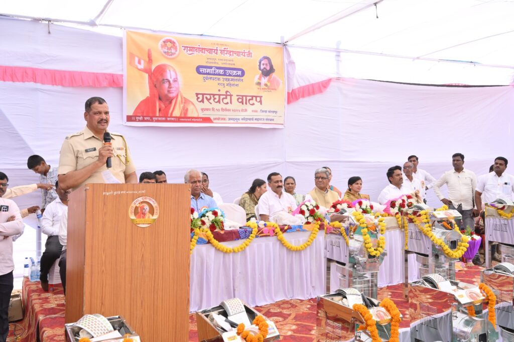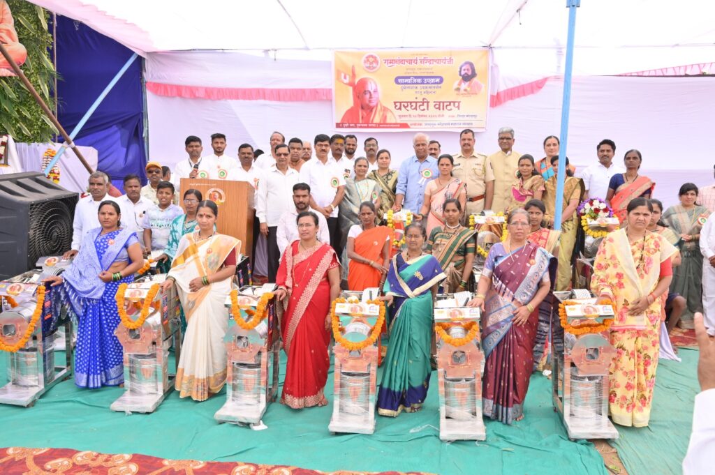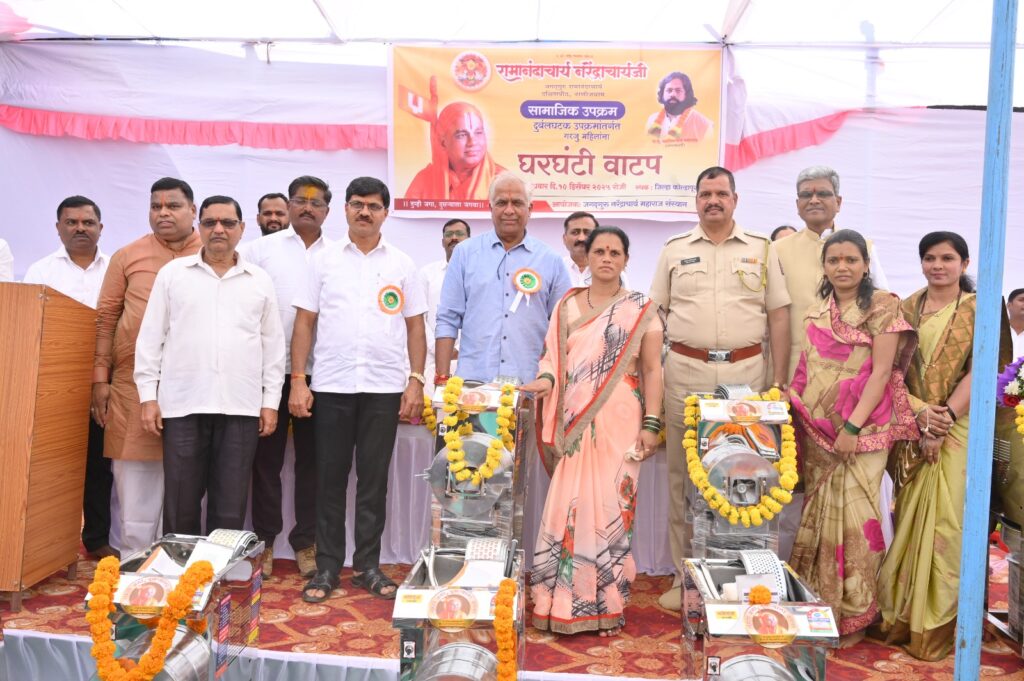 त्या नंतर जगद्गुरु नरेंद्राचार्य महाराज संस्थानाच्या सामाजिक उपक्रमांतर्गत दुर्बल घटक पुनर्वसन उपक्रमा अंतर्गत गरजू महिलांना स्वयंरोजगारासाठी १६ घरघंटी चे प्रमुख मान्यवरांच्या उपस्थितीत वाटप करण्यात आले.