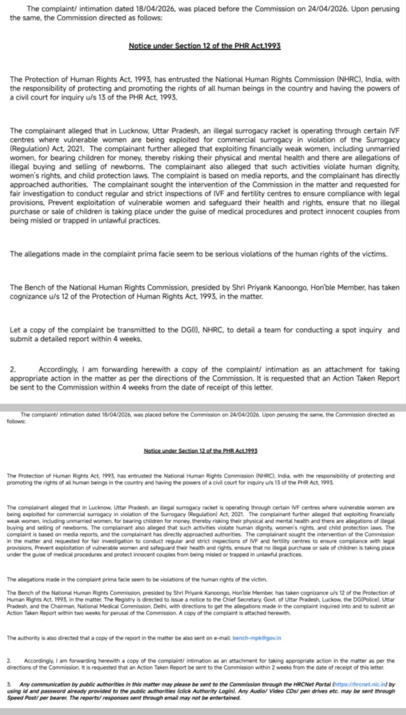 शिकायत में आईवीएफ एवं फर्टिलिटी केंद्रों की नियमित और सख्त जांच की आवश्यकता पर बल दिया गया, ताकि कानूनी प्रावधानों का पालन सुनिश्चित हो, कमजोर महिलाओं के कथित शोषण को रोका जा सके, उनके स्वास्थ्य एवं अधिकारों की रक्षा हो सके, तथा चिकित्सा प्रक्रियाओं की आड़ में बच्चों की किसी भी कथित अवैध खरीद-फरोख्त को रोका जा सके।