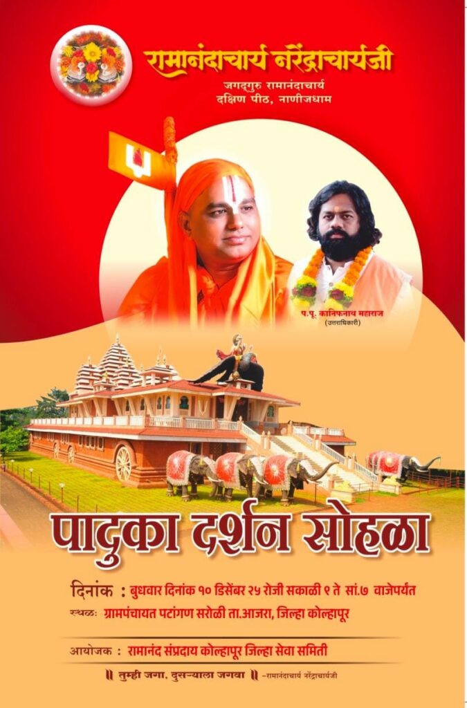 कोल्हापूर:जगदगुरू रामानंदाचार्य नरेंद्राचार्यजी दक्षिण पीठ नाणीजधाम, रत्नागिरी यांचा बुधवार दि.१० डिसेंबर २०२५ रोजी सरोळी ता.आजरा येथे सकाळी ९ वाजले पासून पादुका दर्शन सोहळा व सामाजिक उपक्रमासह संपन्न होत आहे